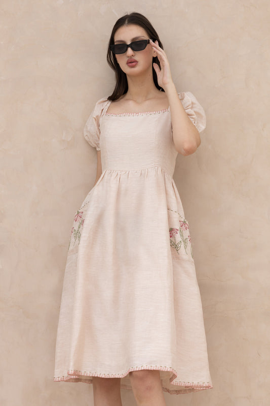 The Kantha Affair Square Neck Linen Pearl Dress| Midi| Peach
